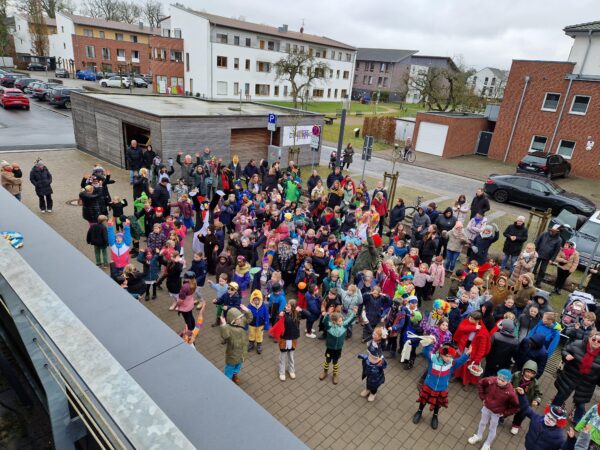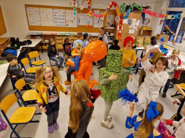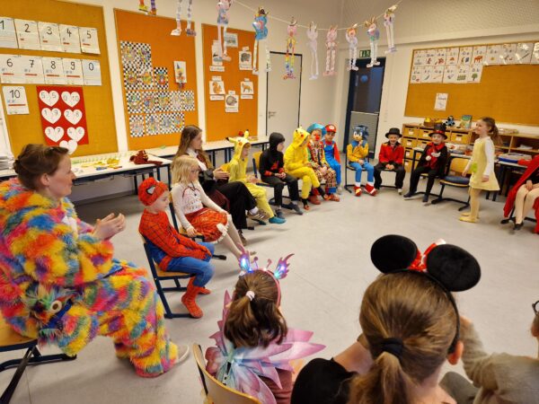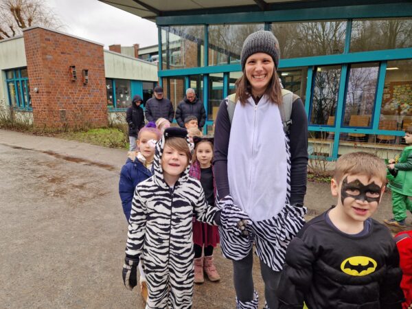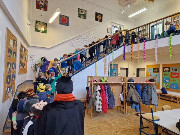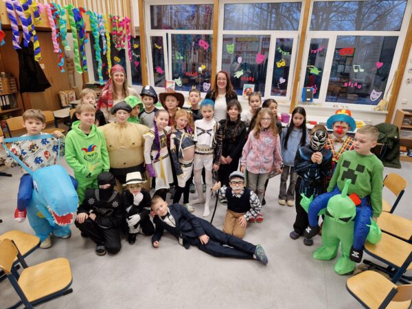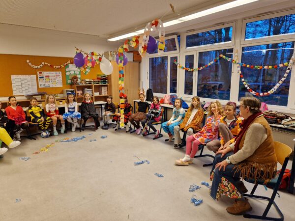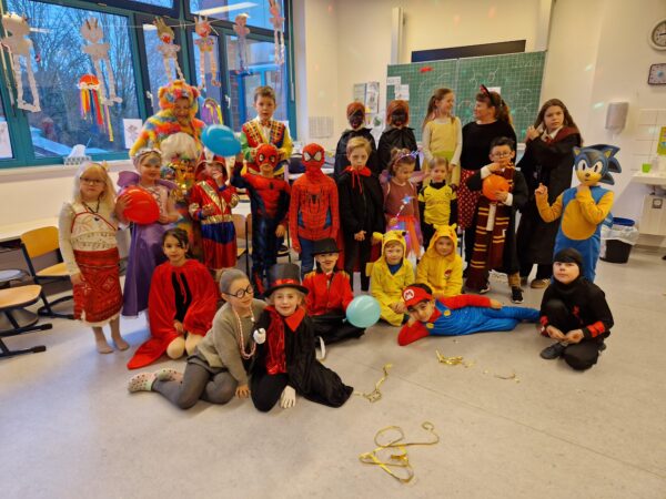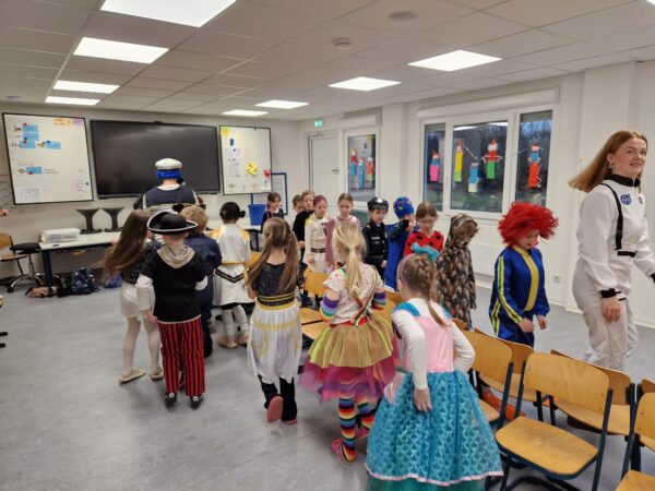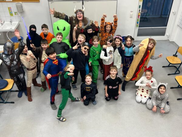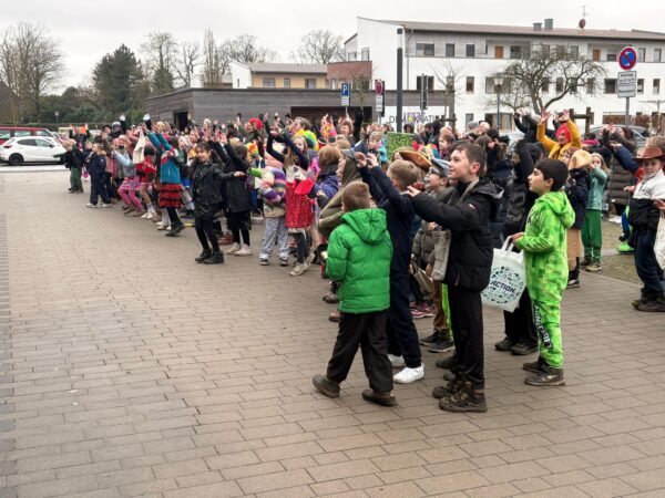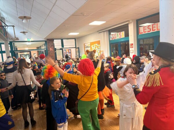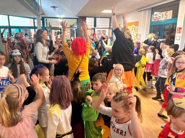 Auch in diesem Jahr machte das jecke Treiben auch vor unserer Schule keinen Halt. Alle Kinder und Erwachsenen waren bunt verkleidet und freuten sich auf einen tollen Tag mit viel Musik, vielen Spielen und einer großer Polonaise zum Rathaus. Zu Beginn wurde in den Klassen gefeiert. Es wurde getanzt, gespielt und es gab auch viele leckere Sachen zu essen. Danach starteten wir mit der gesamten Schule eine Polonaise durch alle Räume der Schule, bevor wir dann gemeinsam im Forum tanzten und sangen. Dabei ertönte oft der Song „gute Laune“, den die Klassen zum Karnvalshit Nr. 1 in diesem Jahr gewählt hatten. Danach wurde auf dem Schulhof weiter gefeiert. In der vierten Stunden machten wir uns mit vielen weiteren Besuchern (Eltern, Großeltern, Geschwistern, …) mit einer Polonaise auf den Weg zum Rathaus. Dort wartete schon der Bürgermeister mit seinen Mitarbeitenden auf dem Balkon auf uns, um mit uns gemeisam zu feiern, zu tanzen und zu singen. Zum Schluss wurde auch noch reichlich Kamelle geworfen, bevor es wieder zurück zur Schule ging. Auch in der OGS wurde später noch reichlich gefeiert. Es war ein toller Tag mit ausgelassener Stimmung und toller Musik.